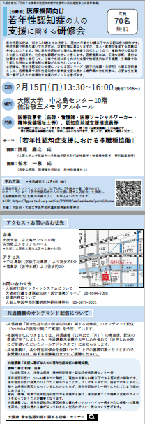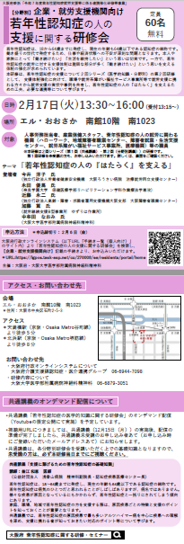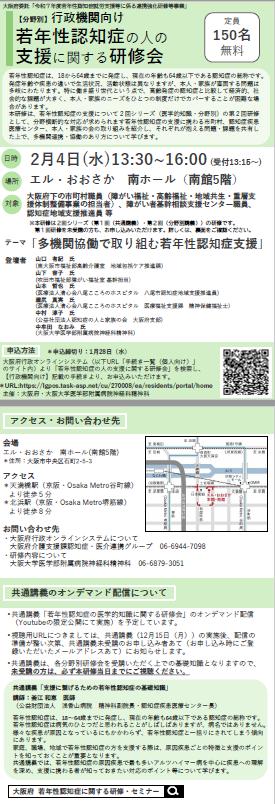大阪府では、行政機関、医療機関、企業・就労支援機関において、若年性認知症の人とそのご家族に対する就労の継続や生活相談等の支援に携わる方の支援力のさらなる向上を図るため、若年性認知症の人やご家族の支援にあたって必要となる当該疾患に関する医学的知識から具体的な支援のポイントなどについて、専門医や精神保健福祉士等の講演を交えながら、医学的知識と分野別の2回シリーズで研修を実施することとしました。 このたび、第2回目となる分野別研修を添付のとおりご案内いたします。